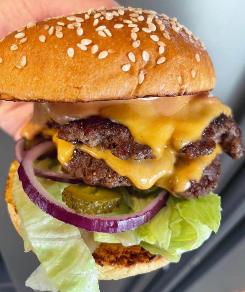 Method: 1.) Form the mince into 4 balls around 100g each. 2.) To make the sauce, combine the tomato sauce, mustard and mayonnaise mixing well. Add in 1 gherkin, finely diced, 2 tsp gherkin vinegar, stir well and set aside. 3.) shred the lettuce, slice the red onion and 1 gherkin and set aside. 4.) Lightly toast the inside of the brioche bun in a dry frying pan over a medium heat and set aside. 5.) cook the streaky bacon under the grill until crispy. 6.) Place 1 burger ball into a frying pan, with a little oil if needed, season with salt and pepper and place a square of greaseproof paper on top, pressing (smashing) the burger down until flat with the base of a small saucepan. Remove the greaseproof and cook for 1-2 minutes on each side. Add a slice of cheese – add a small amount of water (1 tsp if needed) and place a baking tray on top of the frying pan for 30-40 seconds. This creates steam and melts the cheese wonderfully onto the top of the burger. Repeat with the second burger. 7.) Add sauce to each half of the burger bun, adding the lettuce, onion and gherkins before topping with your two smashed cheeseburgers and 2 slices of crispy bacon. Serve with fries or chips and enjoy!